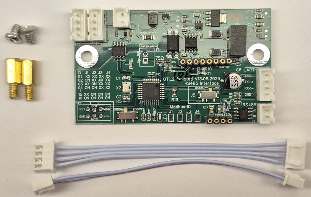 T2HG-Platine, 2x Abstandsbolzen, 2x M4 Schrauben. Zur Überschussladeregelung von R4850G2 Ladegeräten. Weitere Details unter: